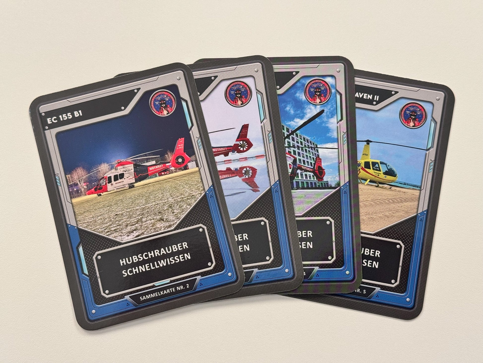 Aktuell gibt es 5 hochwertig gedruckte Sammelkarten aller HEMS Hubschraubertypen, die ich fliege.
